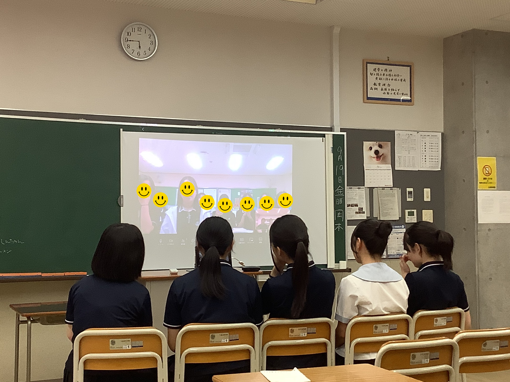 本日、放課後に韓国の姉妹校「鶴城女子中学校」とオンラインで交流しました。お互いの生徒が一人ずつ交互に韓国語、日本語で自己紹介し「日本のアニメが好き」という生徒さんの話から、日本、韓国で人気のある有名人について盛り上がりました。他にも、流行りの食べ物やお菓子を紹介し合ったり、互いの文化に興味をもったきっかけについて話をして、交流を深めました。
