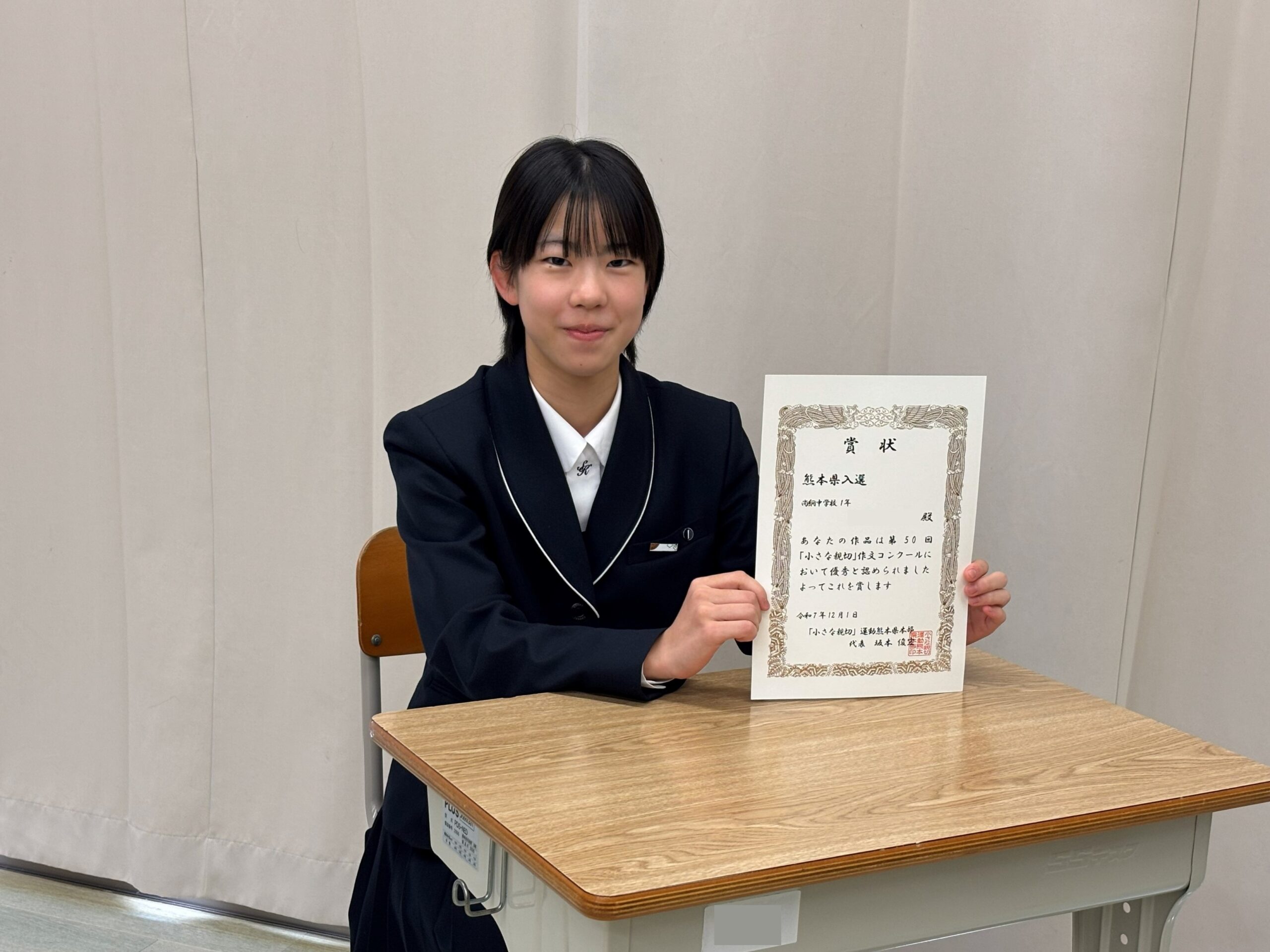 第50回「小さな親切」作文コンクール(主催 公益社団法人「小さな親切」運動本部 後援 内閣府、文部科学省ほか)において、中学1年生の寺尾さんが 熊本県入選 として賞状を頂きました。作文のタイトルは「親切に気づくと成長できる」です。