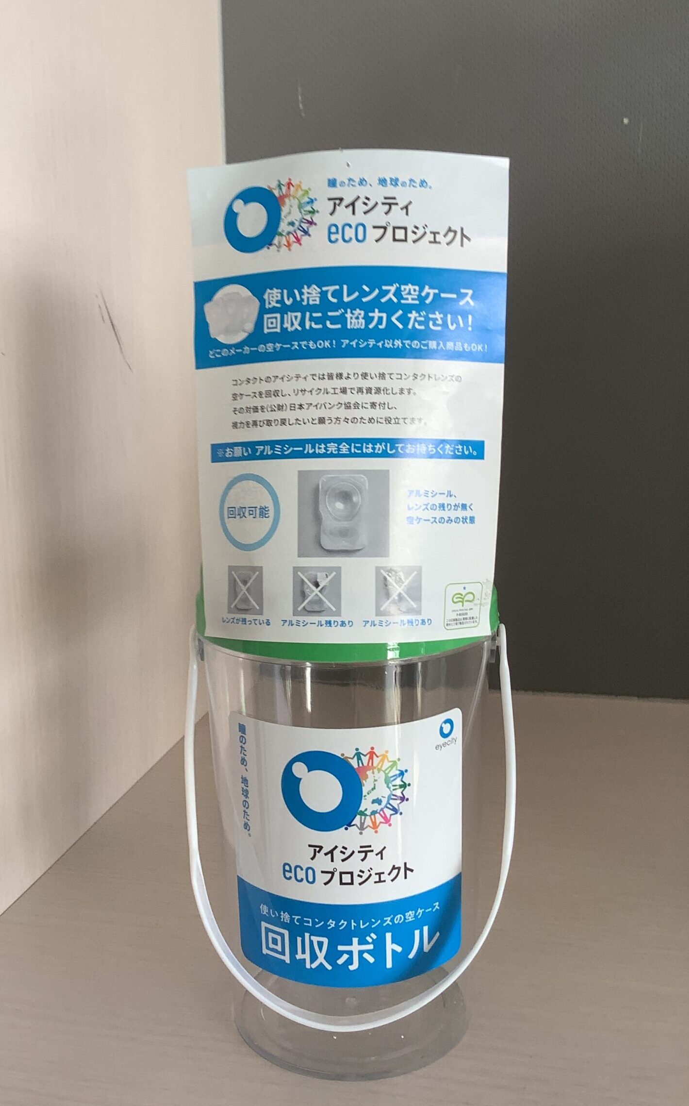 この活動は、各教室に専用の回収ボトルを設置してリサイクルが可能な使い捨てコンタクトレンズの空ケースを回収するリサイクル活動です。3つの社会貢献(1.空ケースの再資源化による環境保全、2.障がい者の自立・就労支援、3.日本アイバンク協会への寄付)へとつないでいくことを目的としています。