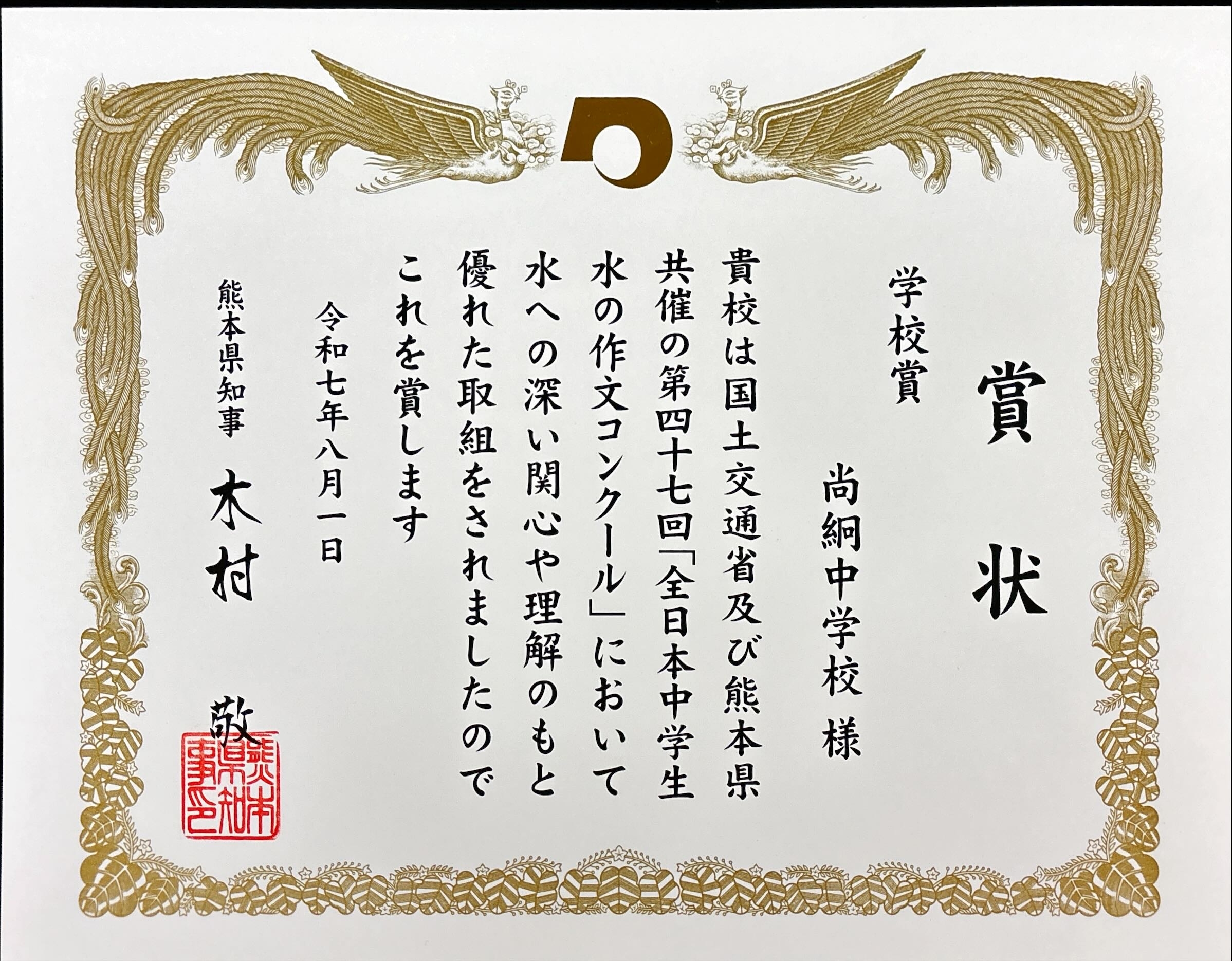 第47回「全日本中学生 水の作文コンクール」(主催:水循環政策本部〈本部長:内閣総理大臣〉、国土交通省、熊本県)の熊本県審査において、本校が「学校賞」を受賞しました。また、以下のみなさんが入選を果たしました。