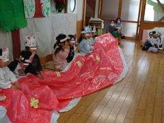劇「もりのおふとん」森に落ちていた大きなお布団。そこに動物たちがやって来ます。