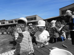 年長さんが、年中時代から一人一鉢で育てたソラマメが収穫の時期を迎えました。ぐるぐる回せばちぎれることに気付いた年長さん。