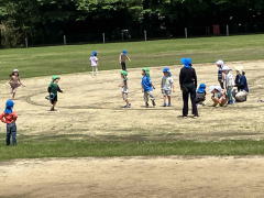 年長さんは大学のグラウンドに出て、リレーをしたりシロツメクサなどの草花を採って遊んだりしていました。