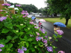 今日の夜中の雨はすごかったですね。梅雨入りももうすぐでしょうか。園の北側花壇ではアジサイの花がきれいに咲いています。