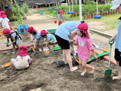 砂場では実習生による研究保育があっていました。水の流れる道を作ったりコーヒー牛乳を作ったりして遊んでいました。