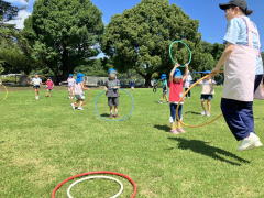 フープを立てた状態で輪っかくぐりをする園児達。