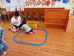 9日(火) 年長さんは大学グラウンドの斜面を使ってウォータースライダーにチャレンジ。