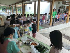 園で採れたキュウリやミニトマトを冷やして、食べやすい大きさに切って渡します。