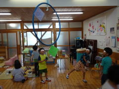 年長さんが紙飛行機を飛ばしていました。輪っかに入ったら成功です。