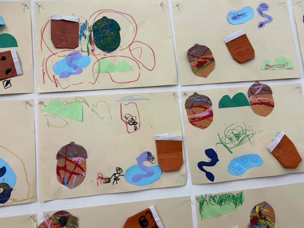 りんご組(年少)はどんぐりを絵の具に浸けていました。何の活動かというと…