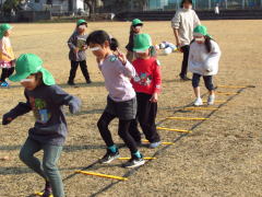 今日から「しっかりあそぼうタイム」が始まりました。10時半ごろから一斉に運動遊びを始めました。これは短大の先生からお借りした「ラダー」です。夢中で運動していました。