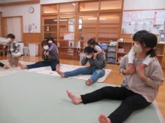 さあ、弁当箱がいっぱいになりました。この後、両足をお箸に見立ててお弁当を食べました。いろいろな動きを物語の中に盛り込むことで、喜んで運動することができたようでした。