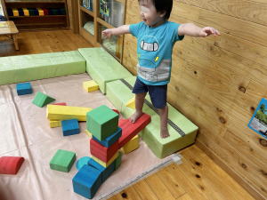 りす組(1歳児クラス)では「橋」を作って、バランスを取りながら渡っていました。