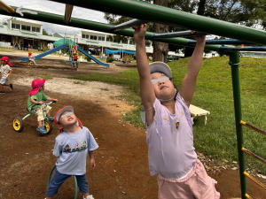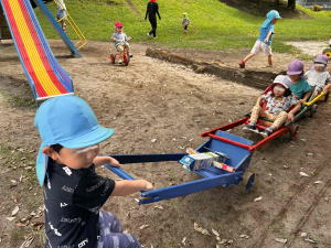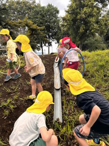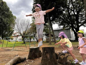 去年は切り株に登ってそろーり下りていた年中さんが、ジャンプして下りれるようになっていました。