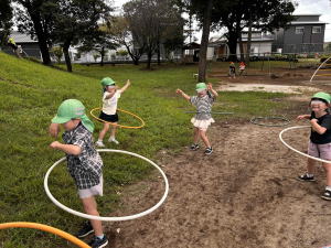 フラフープを転がして遊んでいた年長女子。いつの間にかフラフープ回しに変身。