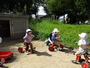 今日、初めて登園したお友だちも元気に三輪車遊びをしていました。
