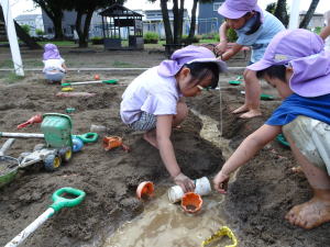 年中さんが砂場に水路を張り巡らして遊んでいました。
