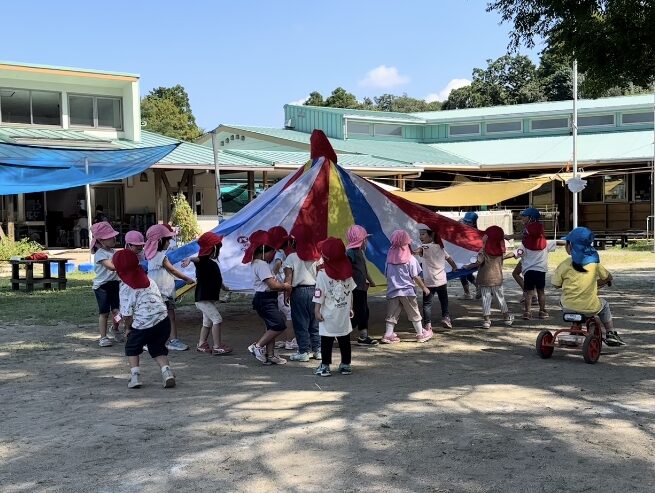 年長さんが運動会で使うバルーンの練習に年少さんも多数応援参加していました。