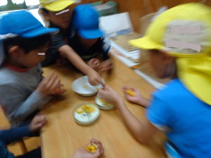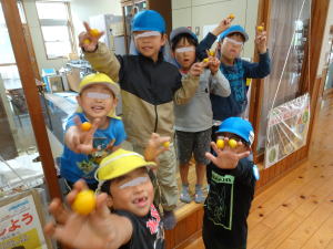 築山とワクワクの森の間にあるキンカンの木の実が黄色く色づいてきました。収穫してきた年長さん。