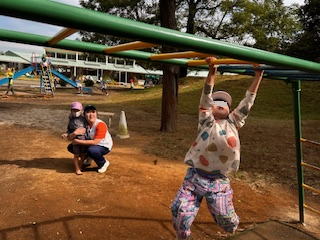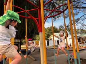 年長、年中、年少の園児が仲良く登り棒をしていました。年少さんも力強く上手になりましたね。