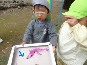 大きなどんぐり虫を見つけた年少さん。