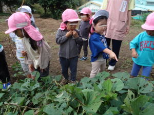 1学期に植えたサツマイモの苗を見に年少さんはワクワクの森に行きました。葉っぱが大きくなっていることに驚いていました。