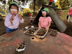 たくさんのきれいな泥団子ができていました。団子と別にトッピング用に黒土場から土を持って来てありました。お団子屋さんから「なに団子がいいですか?」と尋ねられたので「きなこだんご」と答えました。すると「きなこはありません。チョコならあります。」とお店屋さんが言ったので「チョコだんご」を頼みました。ごらんのようにリアルなチョコだんごが出来上がりました。フーフーして冷ましてもくれました。美味しくいただきました。