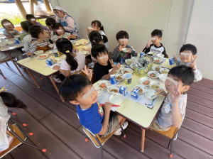 保育室から出てデッキで給食を食べる年長さん