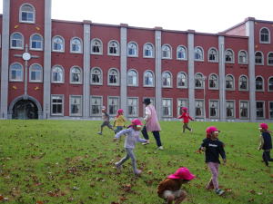 大学芝生広場で実習の先生と鬼ごっこをする年中さん
