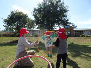 グラウンドに出かけて、輪っかを転がす年少さん