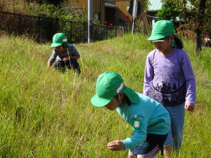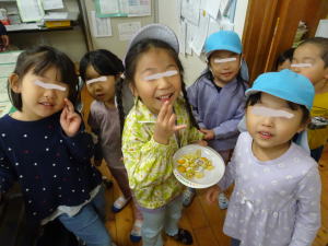 園庭の奥からキンカンを採ってきて、先生に切ってもらいました。試食をさせてもらったのですが、甘みが強くとても美味しかったです。