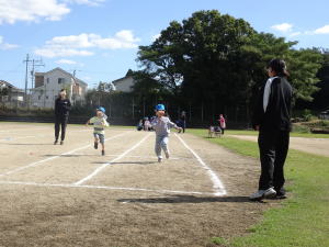 運動能力測定が始まりました。今日は年長さんの50m走です。大学の学生さんがタイムを計ってくれました。それにしても走るフォームがカッコよくなりましたね。