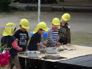 園庭で段ボールを黒く塗る年長さん。運動会の小道具でもなく、何のためでしょう。
