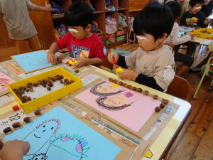 どんぐりを描いた絵の回りに飾りつけする年中さん。すてきな額が出来上がりそうですね。