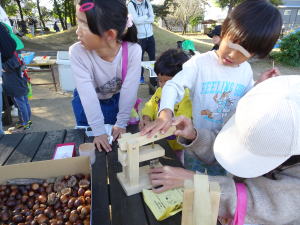 ②「どんぐり遊び」 どんぐり穴あけ器で穴を空けて、爪楊枝を差し込みます。