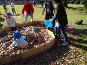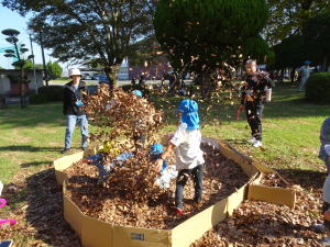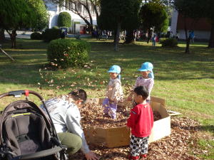 ①落ち葉の遊び(大学芝生広場) 「パパにかけちゃえ。」