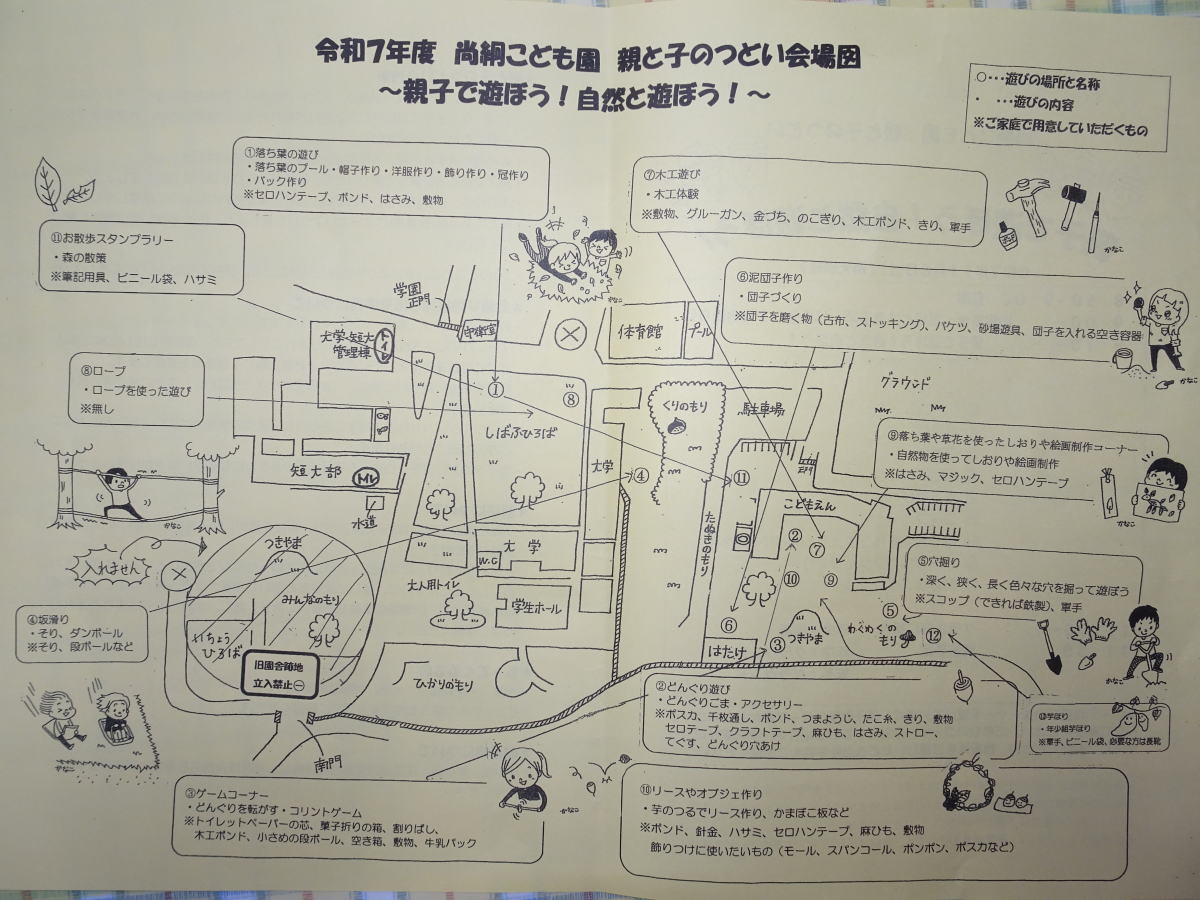 先週の土曜日、本園の園庭やその周辺(わくわくの森、たぬきの森、大学グラウンド、大学芝生広場など)で、年少以上の園児とその家族の方対象に「親と子のつどい」を行いました。