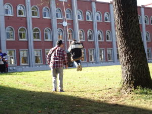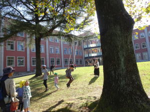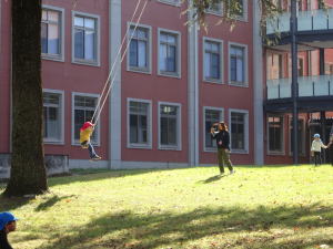 ⑧「ロープ(の続き)」 ロープは綱渡りだけではありません。木の枝に架けて巨大なわとびも設置しました。