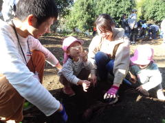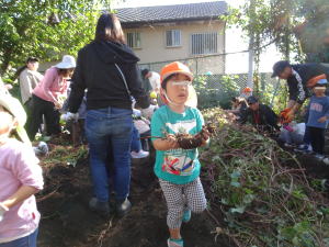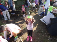 「芋ほり(年少組)」 1学期にわくわくの森に植えたさつまいものつるがのびて収穫を迎えました。