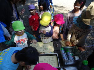 ⑪「お散歩スタンプラリー」 「たぬきの森」などにクイズコーナーがあり、問題に答えながら散策しました。