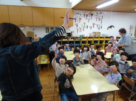 うさぎ組さん、ぱんだ組さんが興味津々、なかよし集会を見ていました。