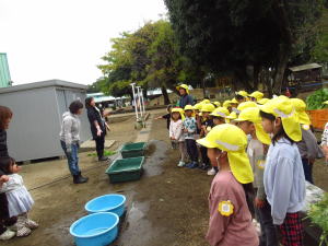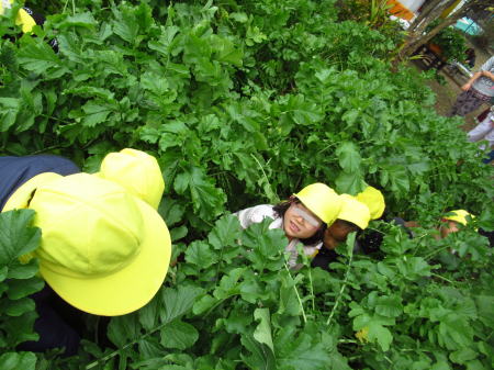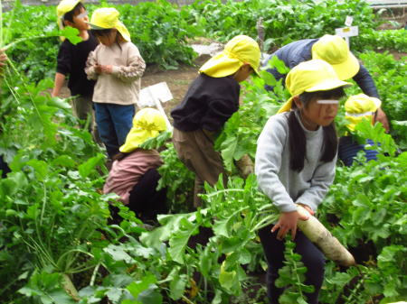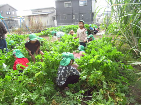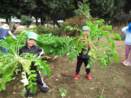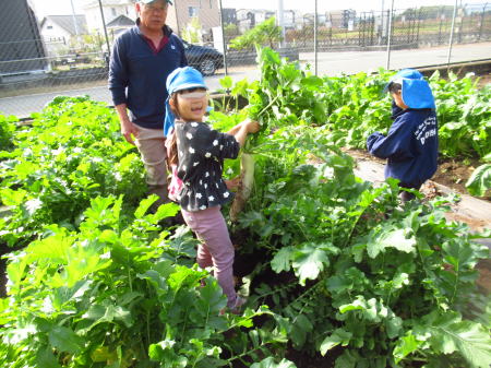 年長さんは、翌日(金曜)のバザーと並行して行われる野菜の販売に向けて、大根やほうれんそうを収穫しました。