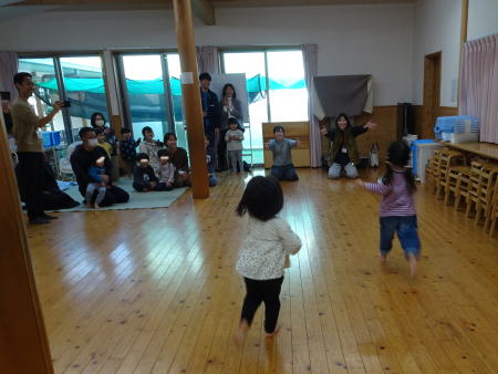 今週は保育参観週間です。今日はぱんだ組(満3歳)でした。ランチルームでミニ運動会がありました。かけっこ競走のシーンです。