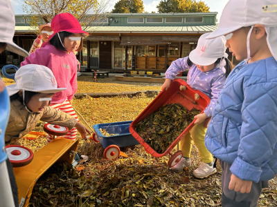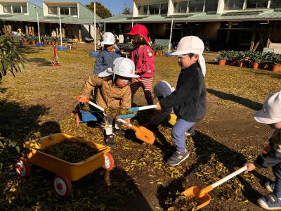 うさぎ組(2歳児クラス)さん等が落ち葉をスコップで一生懸命荷車に入れていました。