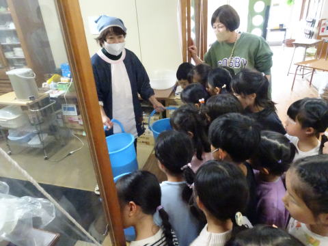 洗ったもち米を配膳室の先生のところに持っていきました。「洗ってくれてありがとうございました。責任もって蒸しますね。」と先生からお礼の言葉があり、園児たちは「よろしくお願いします。」とお願いをしていました。