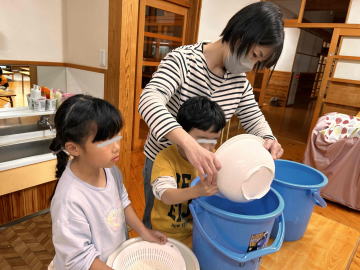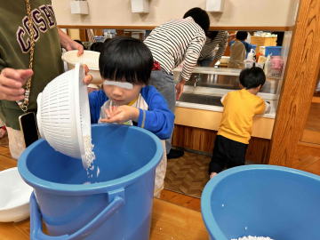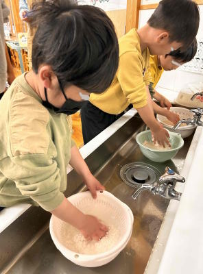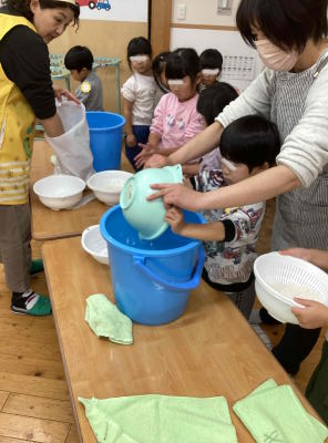 年長組は各クラス10㎏ずつのもち米を園児が洗いました。