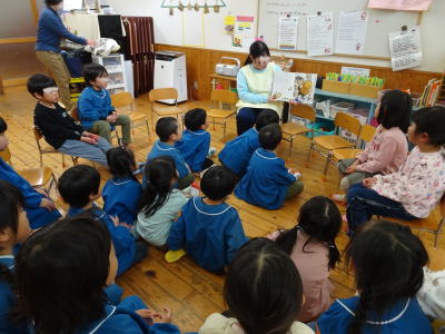 お帰りの集まりのようすから ①実習生に絵本を読んでもらう年長さん。