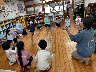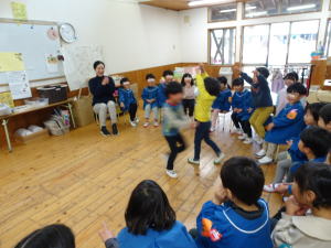 ②「誕生月のおともだち」で盛り上がる年長さん。一人だけでしたが恥ずかしがらずに笑顔で踊ることができていて感心しました。