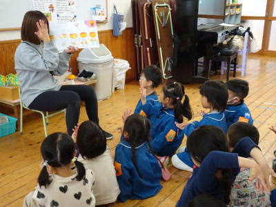 インフルエンザなどの感染症が流行っています。年中さんでは、お帰りの集まりで、絵本を読み聞かせしながら手洗いの仕方を学んでいました。「手の〝こう”ってどこか分かる?」と先生が園児に尋ねていました。