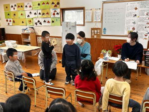 ③フルーツバスケットで盛り上がる年中さん。「椅子に座れなかった時に何と言うか考えておいてね。」と言われ、ある園児は「黄色い服を着ているお友達。」と言いました。該当者は1名でした。